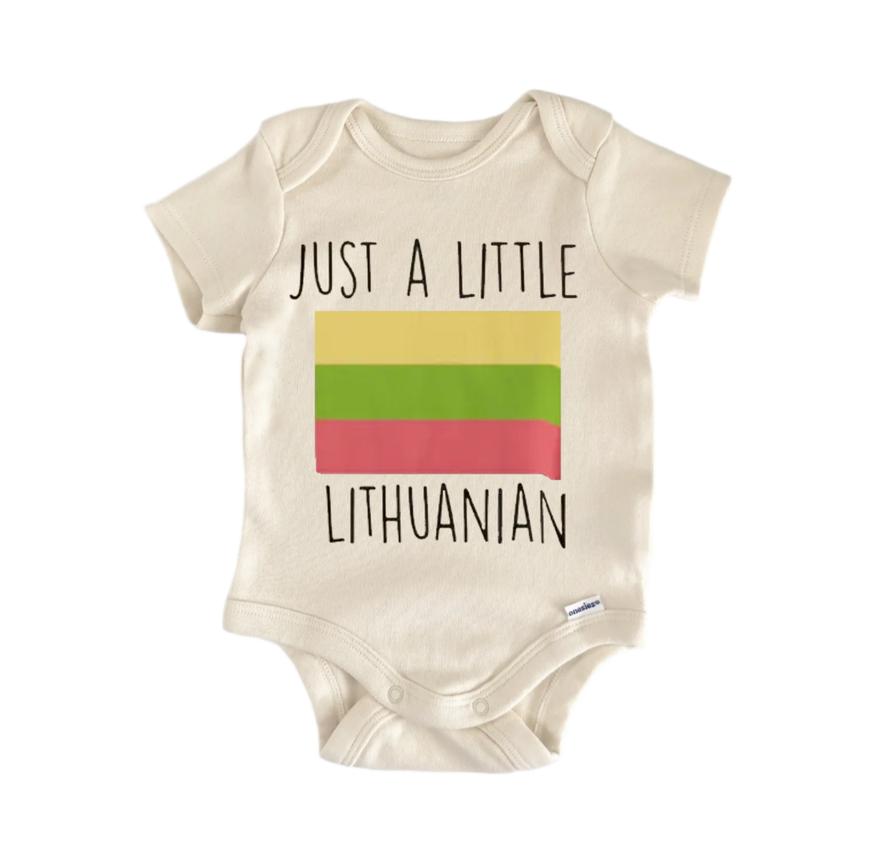 A baby onesie with the text "JUST A LITTLE LITHUANIAN" printed on it.