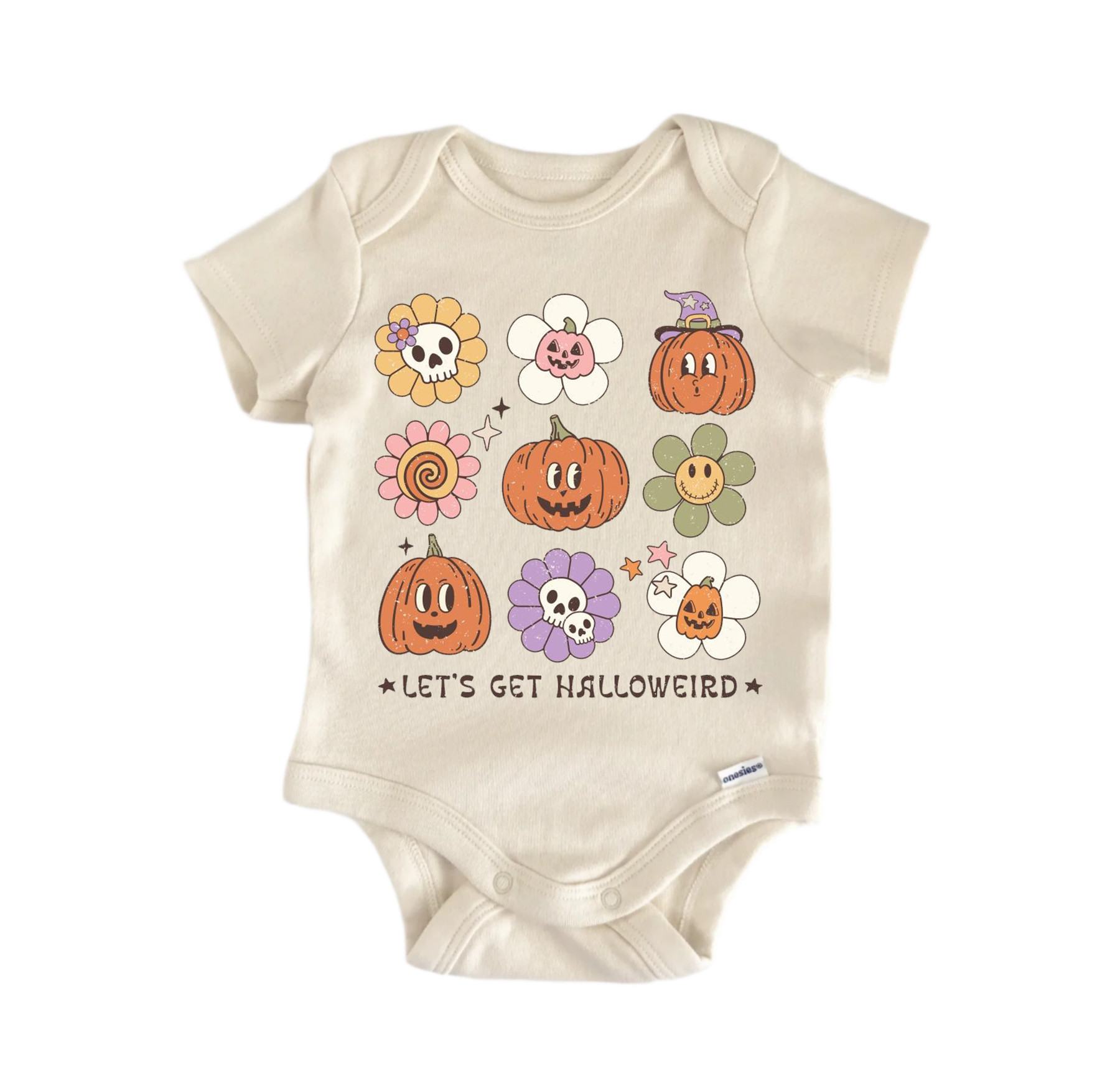 A beige baby onesie with a Halloween-themed design featuring various cartoon-style pumpkins, flowers, and a witch's hat.